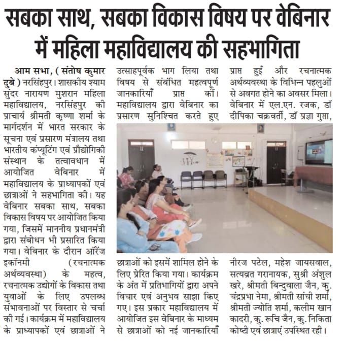 सबका साथ, सबका विकास विषय पर वेबिनार में महिला महाविद्यालय की सहभागिता